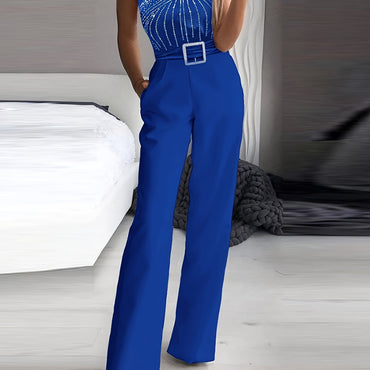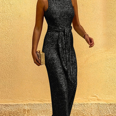 Elegant Sequin Wide-Leg Jumpsuit for Women - Polyester, Stretch Fit, Round Neck, Long Length with Built-In Zipper Closure - Perfect for Evening Dates
