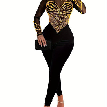 Dazzling Rhinestone Illusion Neck Jumpsuit - Elegant, Long Sleeve, Tight, Stretchy, Party-Perfect, Club-Ready, Women's Clothing for Special Occasions - Ideal for Dancing, Formal Events, and Night Out with Friends
