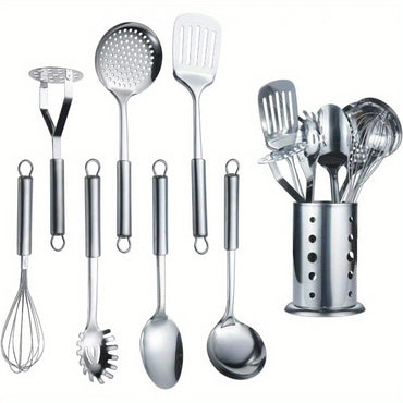 8Pcs Stainless Steel Cooking Utensil Set with Bracket - Slotted Mixer, Spoon, Skimmer, Serving Spoon, Pasta Server, Potato Skewers, Egg Whisk - Essential Kitchen Tools for Everyday Cooking - Perfect Gift for Home Cooks