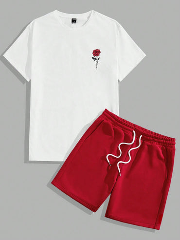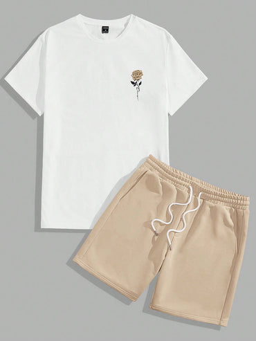 Homme Men's Floral Print Round Neck Short Sleeve T-Shirt And Drawstring Waist Shorts Knitted Casual Two-Piece Set