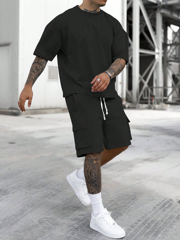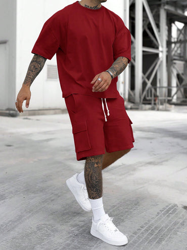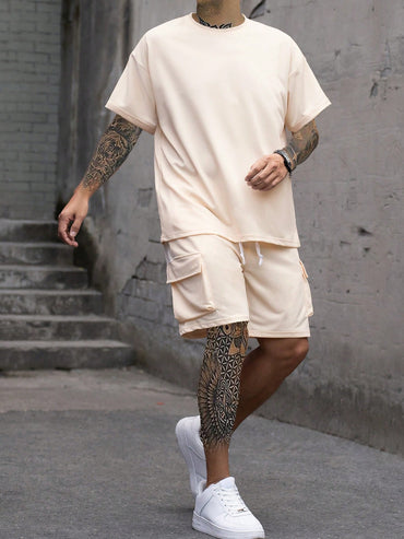 Homme Loose Fit Men's Solid Color T-Shirt And Drawstring Waist Shorts Set