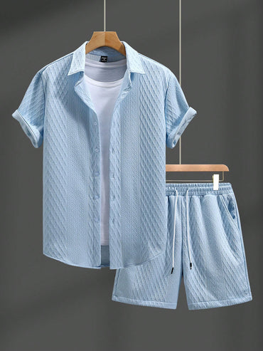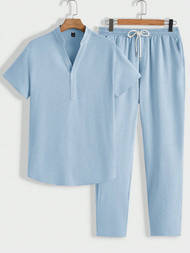 Homme Men Loose Solid Texture Short-Sleeved Top And Pants Casual Summer Set