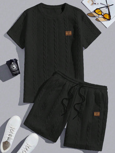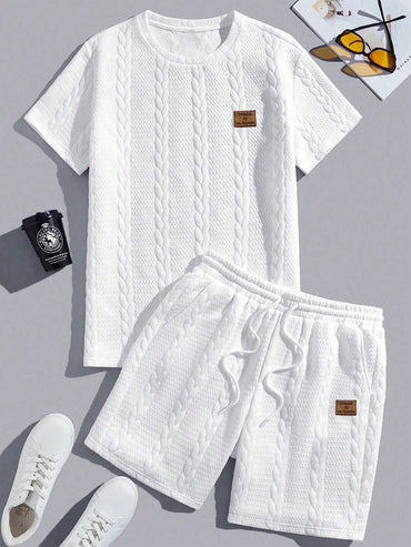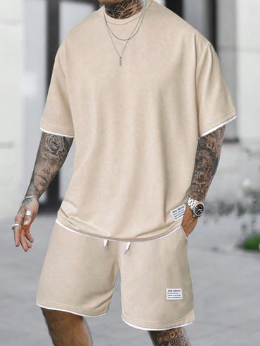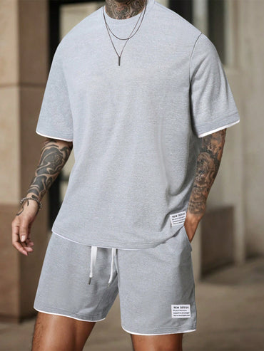 Homme Men Letter Patched Detail Contrast Trim Tee & Drawstring Waist Shorts