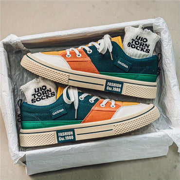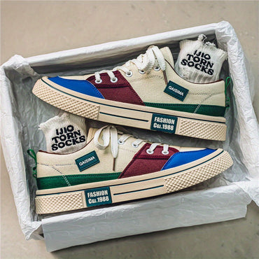 AOPLUS Men'S Color-Block Canvas Sneakers - Low-Top Lace-Up Skate Shoes with "JIO TORN SOCKS" & "GASHIMA" Branding, White & Green Accents, Durable PVC Sole for Casual & Sporty Wear, Skate Shoes, Versatile Footwear, Bold Design, Fabric Lined Interior