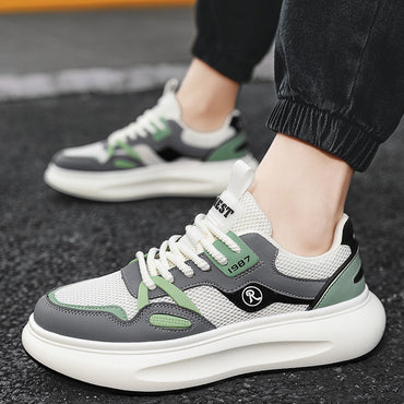 Men's Lightweight Sneakers - Breathable Low-Top Shoes with Non-Slip Rubber Sole, Cushioned EVA Insole - Grey/Green/White Colorway - Gym, Office, Everyday Casual Shoes - Lace-Up Closure, Shoe Insoles, Active Lifestyle, Sleek Design, Comfortable Fit, Daily