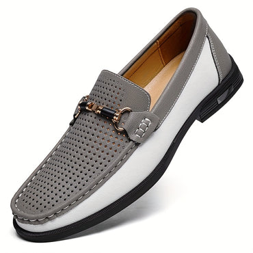 FCSHOU Men's Genuine Leather Slip-On Loafers - Retro Two-Tone Light Blue & White Breathable Perforated Design, Elastic Sides for Easy On/Off, All-Season Casual & Business Casual Shoes with Cushioned PU Insole & Durable Rubber Sole, Leather Shoes, Comforta