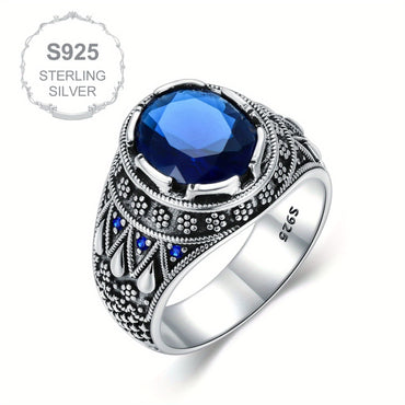 925 Sterling Silver Blue Synthetic Sapphire Ring for Men Oxidized Ottoman Men's Ring for Husband Father, US Size 4-13
