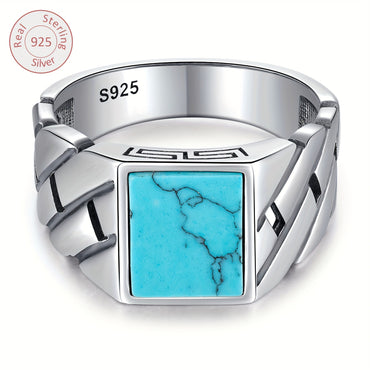 Rectangular Cut Men'S Blue-Green Turquoise Ring, 925 Sterling Silveryy, Handmade Thumb Ring, Birthday Jewelry Gift Ring, Size 8-12, Daily Occasion, Party Occasion, Gift-giving Occasion, Modest Style, Single Ring, Natural Stone Creation Method, Mosaic Mate
