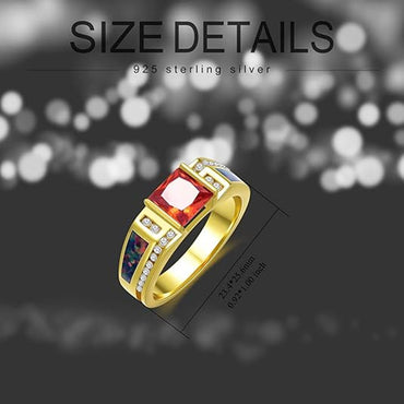 Square Garnet with Gemstone Wedding Ring for Men Sterling Silver Yellow Golden Plated Men's Ring Vintage Retro Jewelry