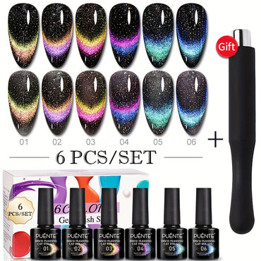 6pcs Gel Nail Polish Set, Double Light Reflective Disco Flashing Cat Magnetic Gel, PUENTE Sparkling Rainbow Cat Eye Nail Gel, 7.5ML Soak Off UV LED Nail Art Varnish Kit