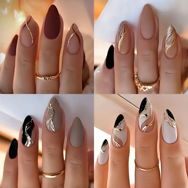 96pcs Almond-Shaped Press-On Nails Set, Medium Length, Mixed Color Stripe Pattern, Glossy Finish - Fashionable Autumn & Winter Nail Art for Women