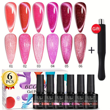 [Diamond Red Magnetic Gel Polish] 6pcs AWStorG Diamond Red Reflective Cat Eye Gel Nail Polish Set - Hypoallergenic, Formaldehyde-Free, Magnetic Glitter, UV/LED Soak Off Varnish - 7.5ml Bottles with Gift Box