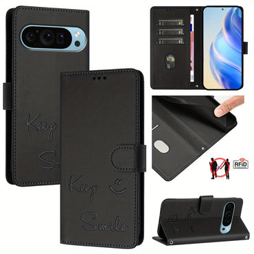 Étui Portefeuille Créatif Noir avec Sourire, Bord Plié Simple et Mignon en Relief Antivol pour Google Pixel 9 Pro XL/9 5G/9A/8 Pro/7A/6/Pixel 5