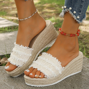 Handwoven Outdoor Slippers for Women, New Summer Style with Wedge Heel, Fashionable Thick Sole High Quality Platform Fish Mouth High Heel Sandals, Bohemian Style Beach Slippers for Women