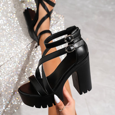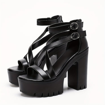 [Elegant Platform Sandals] Women's Elegant Thick Platform Sandals | Open-Toe Summer High Heels with Ankle Strap, PU Cover & Rubber Sole, All-Season Comfort for Casual & Formal Occasions, Chunky Heel Sandals, Formal Footwear, Crisscross Strap Design, Durab