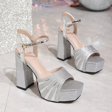 Elegant Women'S High-Heel Sandals, Silvery Glittering Thick-Soled Platform Sandals for Summer Outdoor Wear, One-Strap Open Toe High Heels