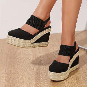 Wedge heel High Quality platform slip-on sandals with elastic straps, back pull-up design, Women's flat-soled high heels for spring and vacation style, bohemian black stilettos