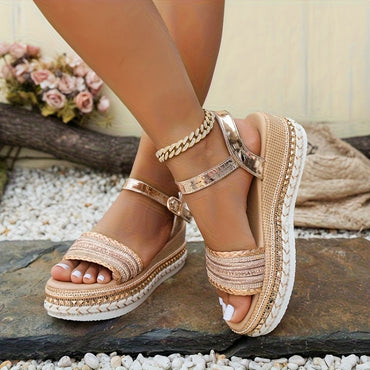 Women's Summer Platform Sandals with Thick Cushioned Sole, Adjustable Hook-and-Loop Closure & Sparkling Ankle Bracelet - Open-Toe Synthetic Cover Casual Beach Shoes for Women, Strappy Sandals, Comfortable Footwear, Durable Rubber Sole