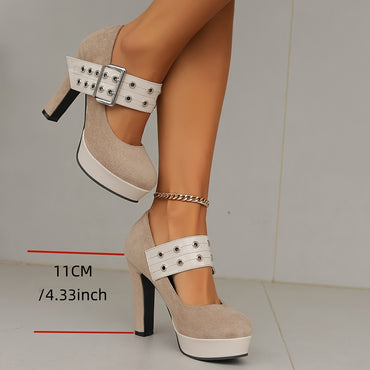 Elegant Black & Beige High Heels for Women - Comfortable Chunky Platform Heels with Ankle Strap, Round Toe, Slip-Resistant Sole - Perfect for Fashion Shows & Stage Performances, Stiletto Heels