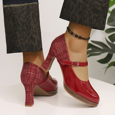 Women's Glossy Red Platform high heels - Chunky block heels, Round Toe, Synthetic Cover/Fabric - All-Season Formal & casual Shoes for Parties, Office, Everyday - Stable Non-Slip TPU Sole, Office Wear, Elegant Design, Stylish Detailing, Fashion Footwear, F