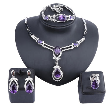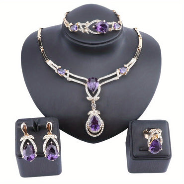 Women Golden Purple Synthetic Zircon Necklace Bracelet Earring Ring Jewelry Set Party Bridal Decoration