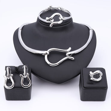 A Unique Middle Eastern Style Jewelry Set for Women Featuring a Shimmering Y-Shaped Necklace, Bracelet, Earrings, And Ring with Distinctive Curved Geometric Cutouts, Perfect for Wedding Party Gifts.