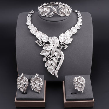 Fashion Jewelry Set - Rhinestone Leaf Necklace, Earrings, Ring, and Bracelet for Women, Bridal, Prom Accessories