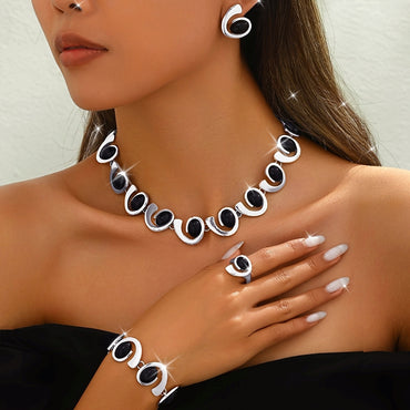 4pcs/set Silvery Women's Fashion Simple Necklace Earrings Bracelet Ring Set Geometric Oval Black Acrylic Inlaid Spiral Splicing Beaded Pendant Necklace Bracelet Ear Stud Ring Bohemian Spiral Design Jewelry Set