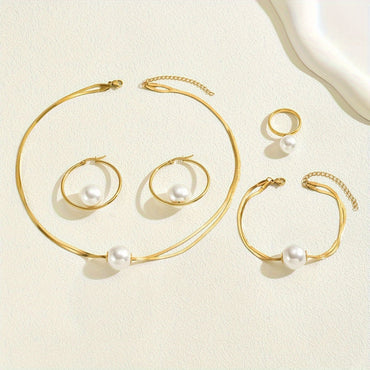 [5-Piece Vintage Jewelry Set] 5-Piece Set, Women's Fashion Jewelry, Vintage & Minimalist Style, 18K Golden Plated, Stainless Steel, Faux Pearl, Necklace, Earrings, Ring, Bracelet, Versatile for Daily & Party Wear, All-Season Accessory
