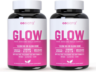 Glow Vitamins - Hair Skin and Nails Multivitamin Supplement - 10,000mcg Biotin Pills with Hyaluronic Acid, Folate, Iron, Magnesium, and Zinc - Boosts Collagen Production, Hair Growth, 90 Capsules