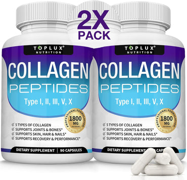 Toplux Multi Collagen Peptides Pills 1800 Mg Complex - Type I, II, III, V, X Premium Collagen Complex for Better Skin & Hair, Strong Joint, Hydrolyzed Protein, for Men Women, 90 Capsules, Supplement