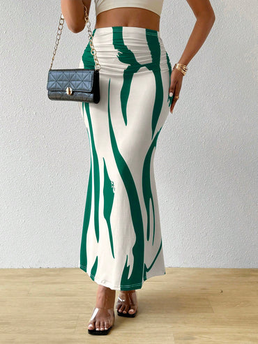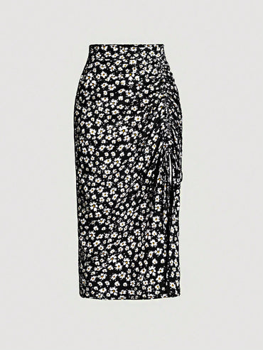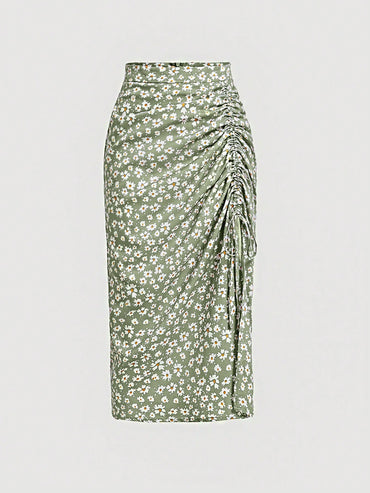 Marika Sila SHEIN MOD Ditsy Floral Print Drawstring Ruched Summer Green Skirt