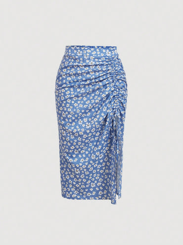 Details: Drawstring, Ruched, Zipper, Split Thigh Style: Boho Type: Slit Color: Multicolor Pattern Type: Ditsy Floral Waist Line:...