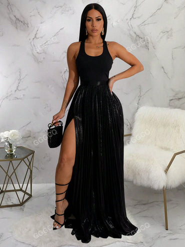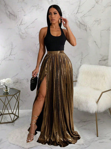 Women's High Slit Maxi Metallic Skirt, Suitable For Party Wear