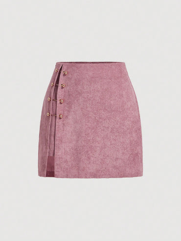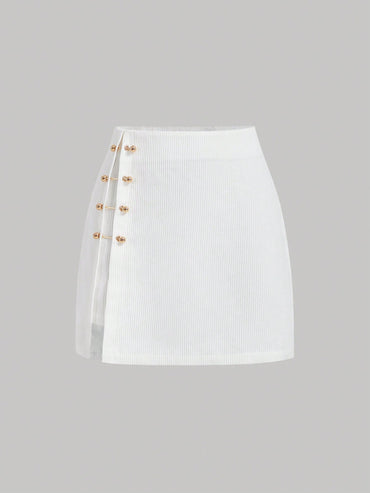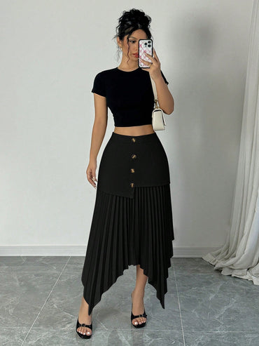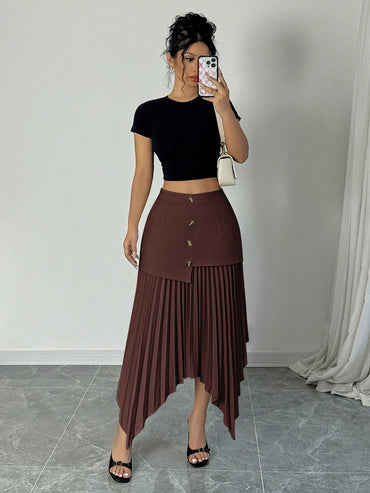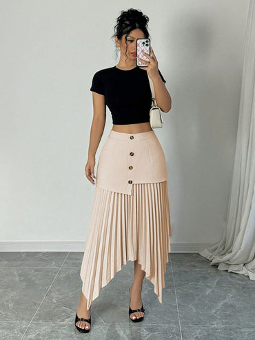 Elenzga Button Front Asymmetrical Pleated Hem Skirt