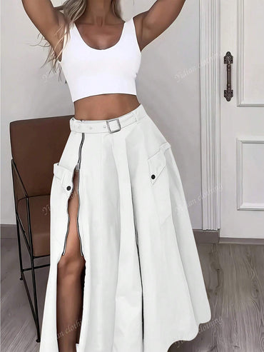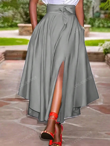 Women High Waist Solid Color A-Line Skirt With Hidden Pockets And High Slit, Casual