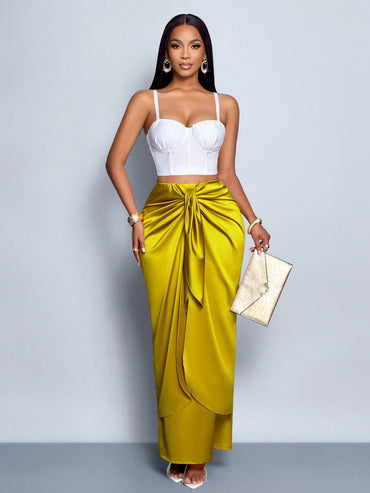 SOLERSUN Women's Elegant Simple Romantic Tie Front Satin Maxi Skirt,Versatile For Date, Commuting, Office Outfit
