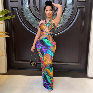 Style: Sexy Fit: Slim Fabric: Polyester Pattern: Printed Element: Backless,Cutout,Tie Neckline: Halter Sleeve Type: Others Sleeve Length: Sleeveless...