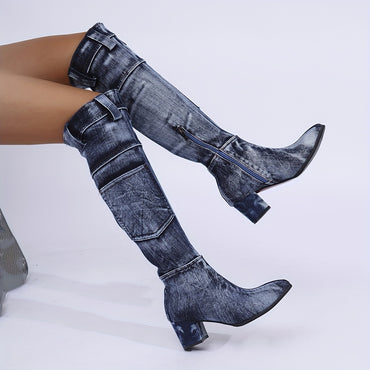 [Solid Color Block Heel Pointed Toes] 1pr Retro Chic Over-the-Knee Boots for Women - Solid Color Block Heel, Pointed Toe, Zipper Closure, Fabric Upper/Inner, Rubber Sole, Man-Made Insole - All-Season High Heel Rider Booties