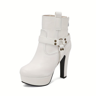 [Versatile Ankle Boots] Chunky Heel Women's Ankle Boots | Round Toe Lace-Up Faux Cover Boots with Rubber Sole, All-Season Versatile White Boots for Casual & Formal Outfits, Casual Chic Boots | Side Buckle Accent | Stylish Zipper Detail