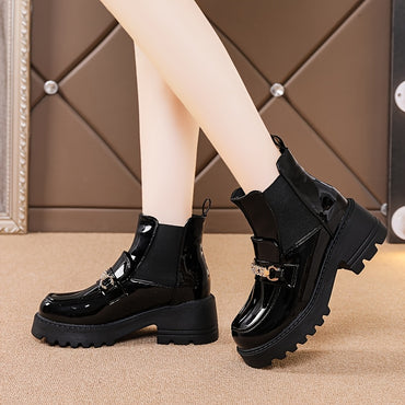 [Chunky Heel] Women's Chunky Heel Ankle Boots | 12cm Platform | Faux | Decorative Studs, Zipper Closure | Winter Boots for Dresses | Elegant, Black