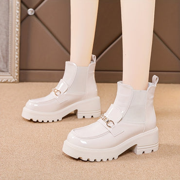 Women's Slip-On Chunky Platform Ankle Boots - Round Toe Faux Cover Mid-Heel Boots with Thick Rubber Sole, Versatile Casual to Dressy White Booties for Casual Attire, Stylish Footwear