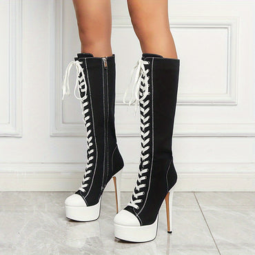 Women's Black & White Color Block High Quality Platform Winter Knee-High Boots with Chevron Straps, Ultra-High Stiletto Heel, Round Toe & Zipper Closure - PU Sole & Fabric Lining for Formal Events, Semiformal Footwear, High Heel Boots