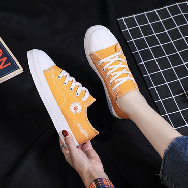 Women'S Casual Low-Top Sneakers - Vibrant Orange Canvas with White Daisy & Cursive Design, Lace-Up Rubber Sole Shoes for All-Season Comfort, Ladies Sneakers