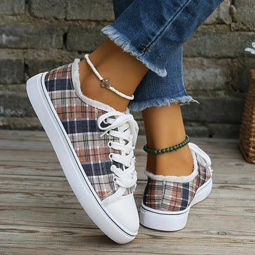 Women's Plaid Pattern Sneakers, Lace Up Lightweight Flat Soft Sole Walking Skate Shoes, Low-top Comfort Canvas Shoes