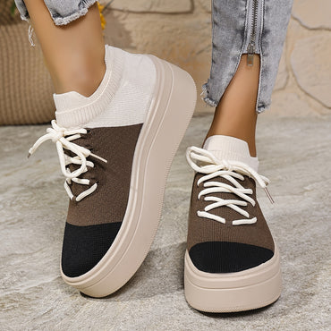 Women's Plus Size Casual Chunky Sneakers - Breathable Knit Upper, Two-Tone Color Blocking (White & Brown), TPR Sole, Lace-Up Closure, Comfortable Low-Top Design for Casual Attire, Casual Footwear | Twotone Sneakers | Knit Fabric Upper