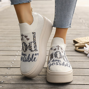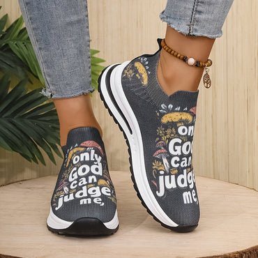 Women's Comfort Knit Sneakers - Vintage Letter Print, Thick Cushioned Sole, Slip-On Casual Shoes, Lightweight & Breathable Fabric for All-Day Wear