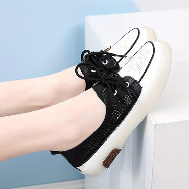 Women'S Retro Platform Sneakers - Breathable Cut-Out Design, Soft Cushioned Sole, White & Black Lace-Up Casual Shoes for All-Season Comfort, Ladies Sneakers, Comfortable Footwear, Durable Tpr Sole