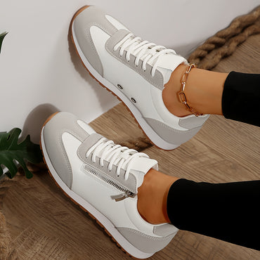 [Comfortable Sneakers] Lightweight, Breathable Women's Gray PU Sneakers | Comfortable, Casual, Low-Top Design with Side Zipper and Lace-Up Closure - All-Season Wear
