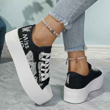 1 Pair Women'S Embroidered Canvas Sneakers, Non-Slip Stabilizing All-Season Thick Sole Fashion Shoes with Fabric Insole